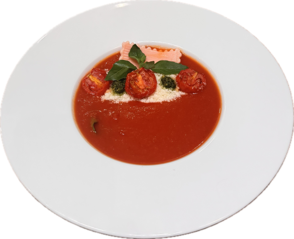 meleg paradicsomleves San Marzano D.O.P. | Grana Padano D.O.P. | szárított paradicsom | ricotta ravioli | friss bazsalikom