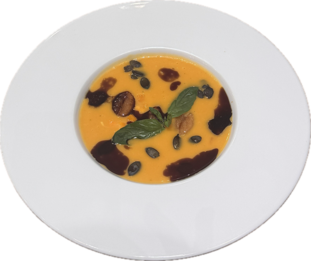 sütőtök krémleves | gnoschetti | pirított guanciale | sütőtök kockák | tökmag | tökmagolaj | bazsalikomlevél