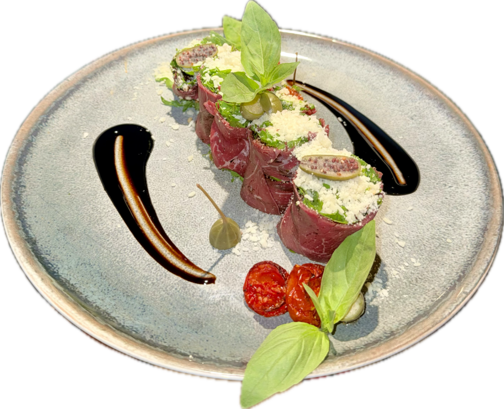 Black Angus bélszín | koktélparadicsom | óriás kapribogyó | beef mayo | extra szűz olívaolaj | Grana Padano D.O.P. | rukkola