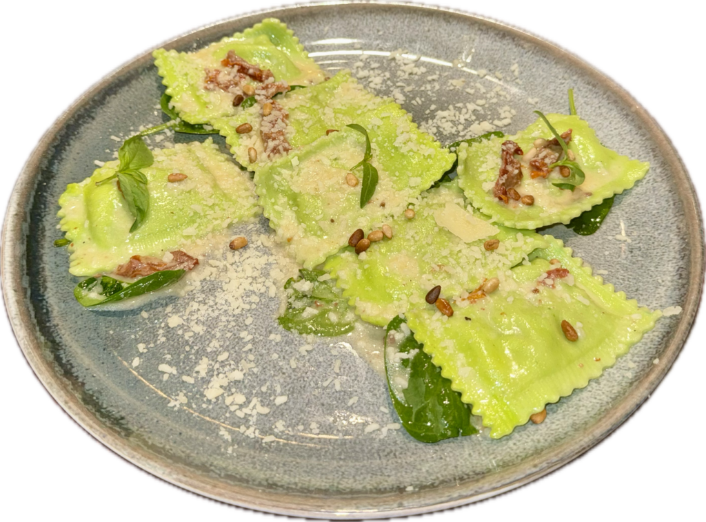 friss házi ravioli | vargánya | csiperke | szarvasgomba | házi pesto | Grana Padano D.O.P. | friss bazsalikom | zsályás barnavaj | dió grillázs