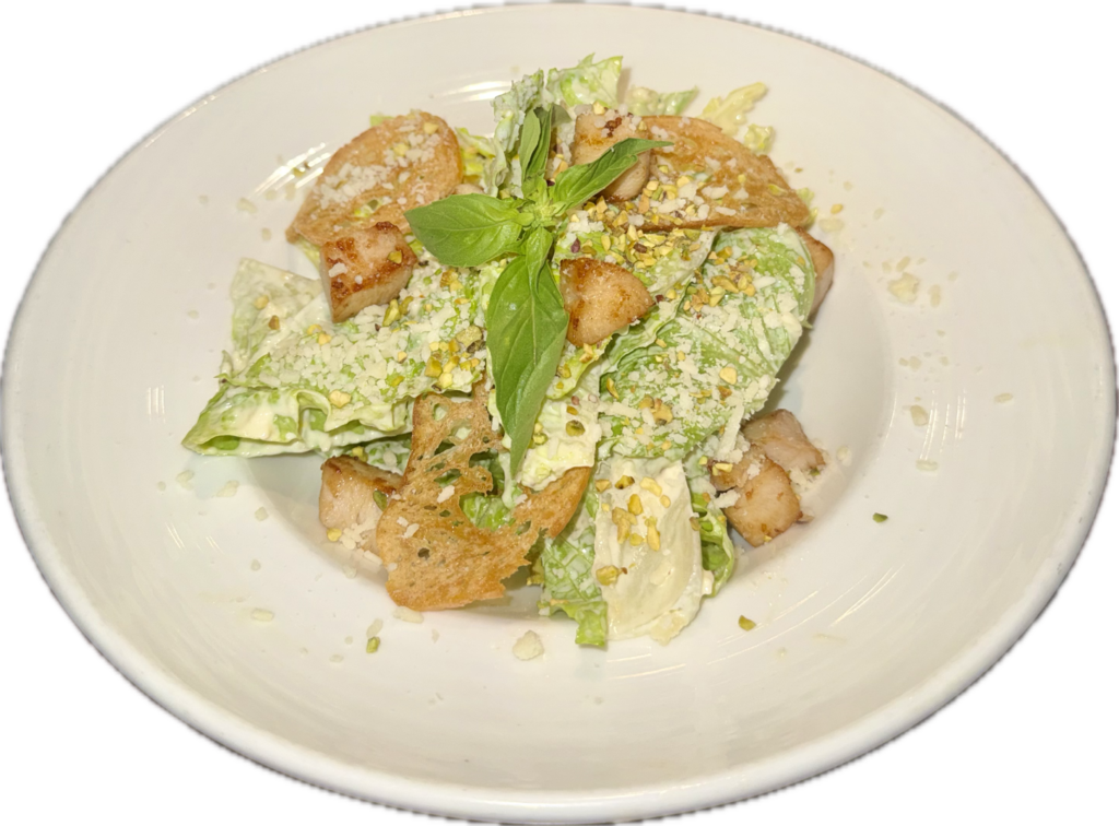 friss házi trecce | házi bazsalikom pesto | pirított pisztácia | bufala burrata | Grana Padano D.O.P. | szárított koktélparadicsom | friss bazsalikom